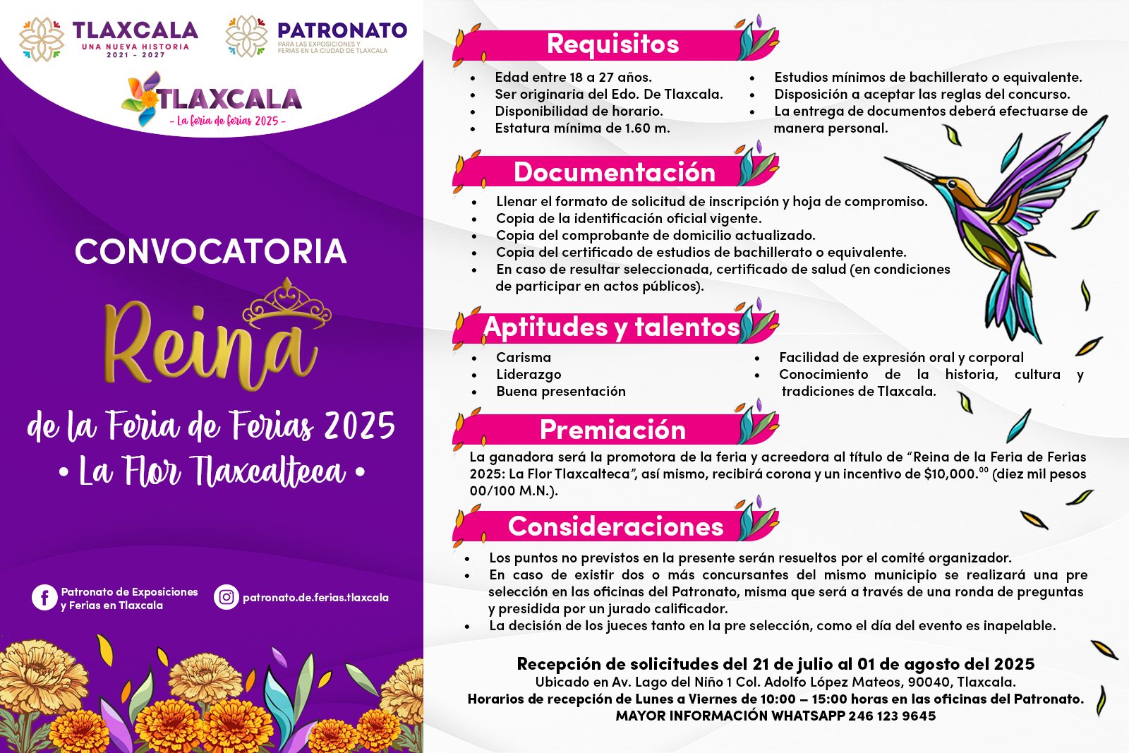 Para mayores informes, se puede consultar directamente en el Patronato o enviar mensaje vía WhatsApp al número 246 123 9645. Esta es una oportunidad para que las jóvenes tlaxcaltecas representen con orgullo su municipio y se conviertan en imagen oficial de la feria más importante del estado.