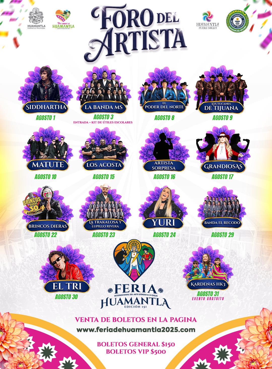En el Foro del Artista 2025 se presentarán figuras como Siddhartha, Banda MS, Los Tucanes de Tijuana, El Tri, Yuri, La Trakalosa de Monterrey junto a Lupillo Rivera, Matute, Los Acosta, Brincos Dieras, Grandiosas y un artista sorpresa, además de la actuación gratuita de Kardenas HK3.